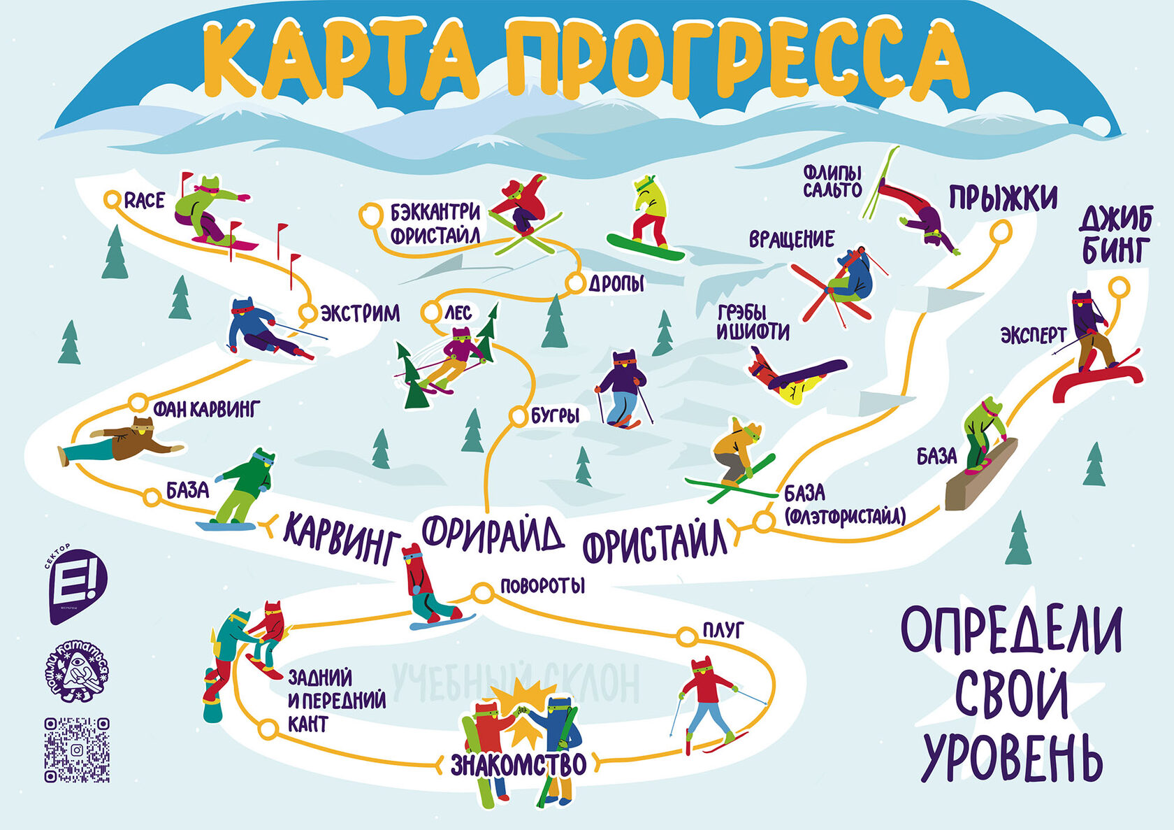 Перед вами карта развития навыков любого лыжника и сноубордиста. По ней вы можете ориентироваться и определять свой текущий уровень катания и ставить перед собой цели, которых желаете достичь. А мы поможем выстроить точный план и составить тренировочный процесс для достижения этой цели.